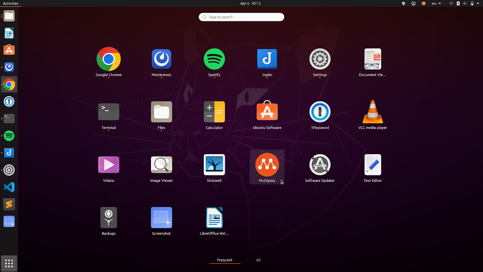 Start Multipass from the application launcher. In Ubuntu, press the super key and type “Multipass”, or find Multipass in the Applications panel on the lower left of the desktop.
