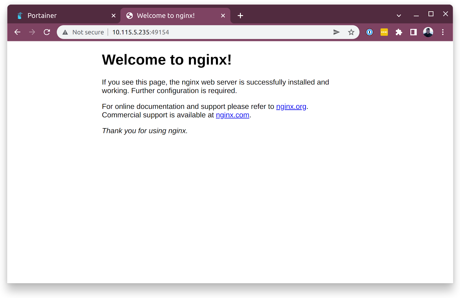 From the Portainer dashboard, you can see the ports available on nginx. To verify that you have nginx running in a Docker container inside Multipass, open a new web page and paste the IP address of your instance followed by one of the port numbers.